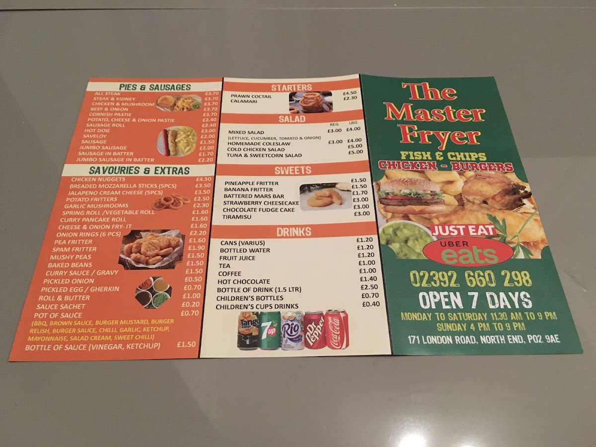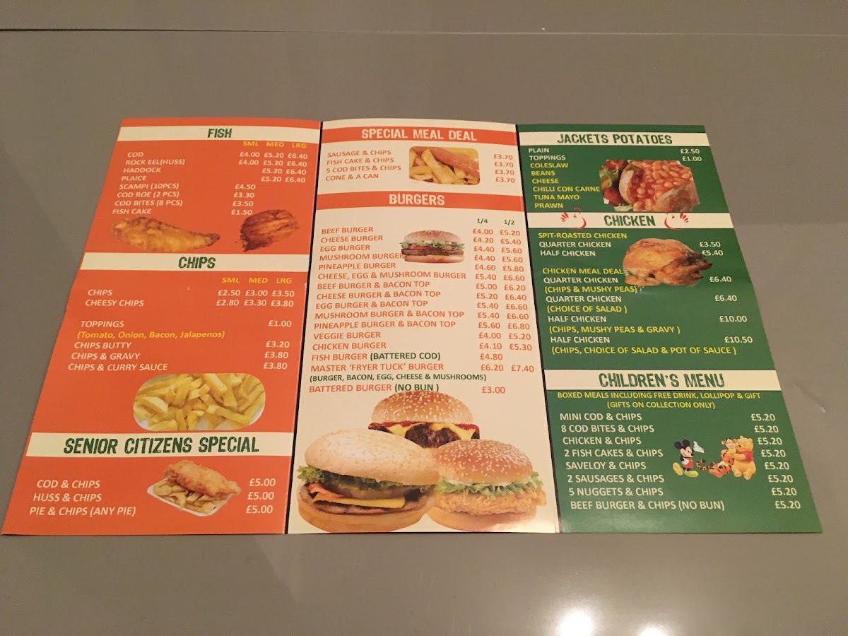 From a reviewer’s perspective, the menu at Master Fryer offers a classic and satisfying range of traditional chip shop favourites, with plenty of choice across categories. The All Steak, Steak & Kidney, Chicken & Mushroom, Beef & Onion, and Cornish Pastie pies provide hearty options, while sides like Chicken Nuggets, Breaded Mozzarella Sticks, Jalapeno Cream Cheese, Potato Fritters, and Garlic Mushrooms add variety. Seafood lovers can enjoy staples such as Rock Eel, Haddock, Plaice, Scampi, and Cod Roe, best paired with Chips or Cheesy Chips. There are also lighter options like Mixed Salad, Homemade Coleslaw, Cold Chicken Salad, and Tuna & Sweetcorn Salad, along with desserts including Pineapple Fritter, Banana Fritter, Battered Mars Bar, Strawberry Cheesecake, and Chocolate Fudge Cake. With meal deals such as Sausage & Chips, Fish Cake & Chips, and 5 Cod Bites & Chips, plus a dedicated children’s menu and roast chicken options, the menu is well-rounded, affordable, and suited to a wide range of tastes.